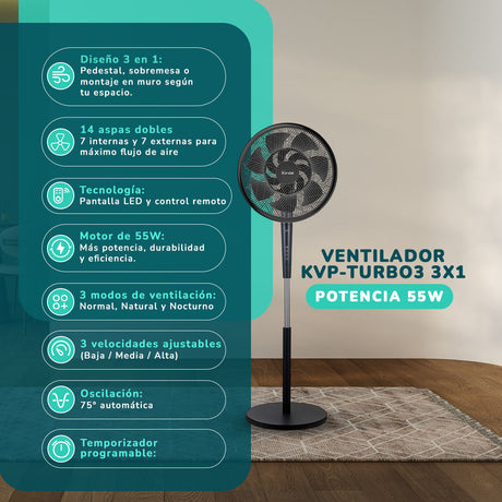 Ventilador Kendal KVP-TURBO3 3x1 - Aspas Dobles 14 - 55W - Control Remoto y Pantalla LED